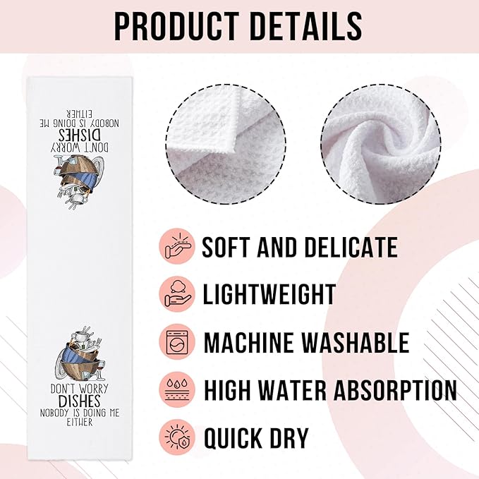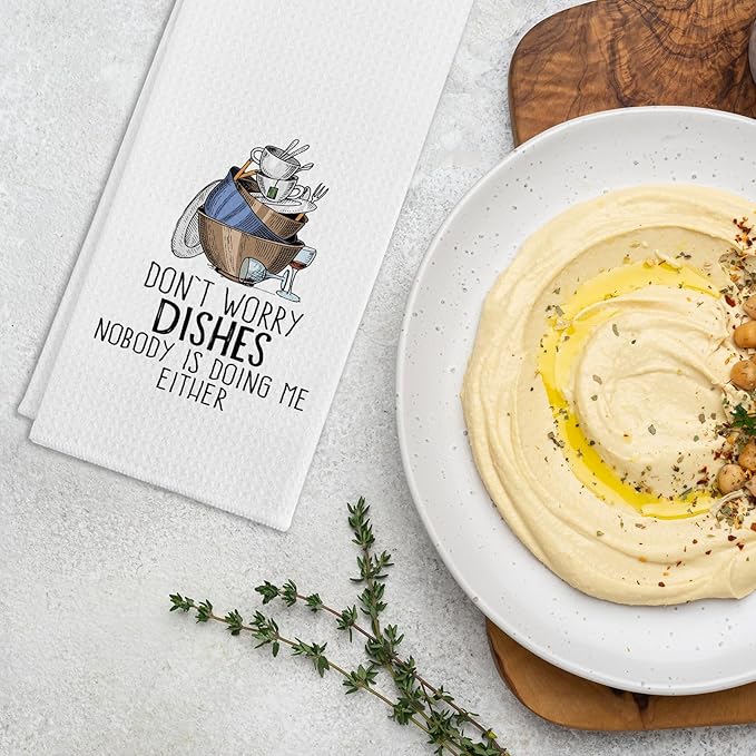 - Unique Design: Our funny kitchen towel with saying "Don't Worry Dishes Nobody is Doing Me Either". The simple yet cute text patterns can bright up your kitchen and surprise your family and friends. It's a perfect kitchen gift for your favourite chef.