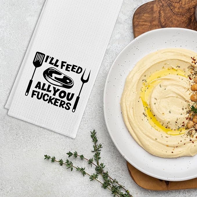 - Unique Design: Our funny kitchen towel with saying "I'll Feed All You Fxxkers". The simple yet cute text patterns can bright up your kitchen and surprise your family and friends. It's a perfect kitchen gift for your favourite chef.