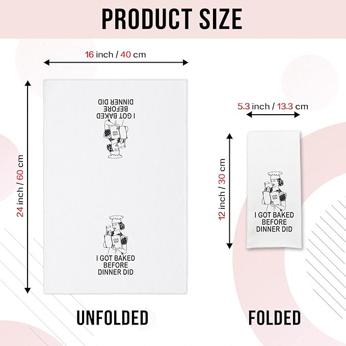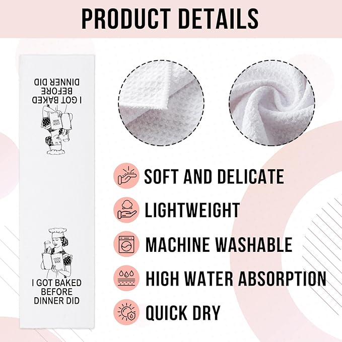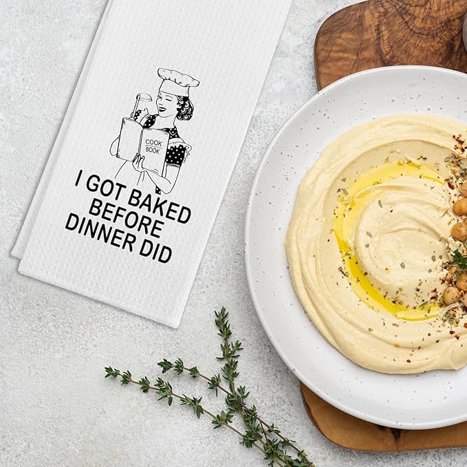 - Unique Design: Our funny kitchen towel with saying "I Got Baked before Dinner Did". The simple yet cute text patterns can bright up your kitchen and surprise your family and friends. It's a perfect kitchen gift for your favourite chef.
