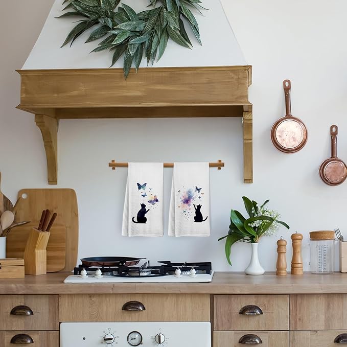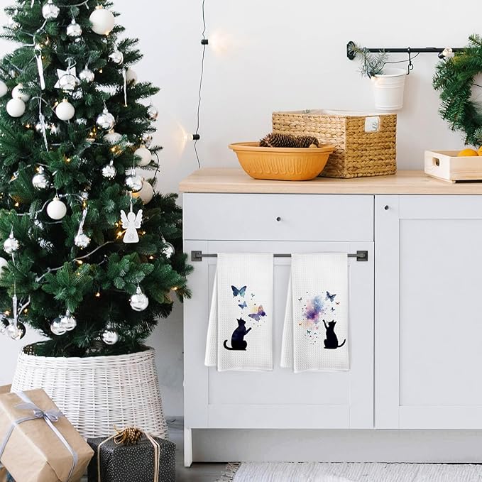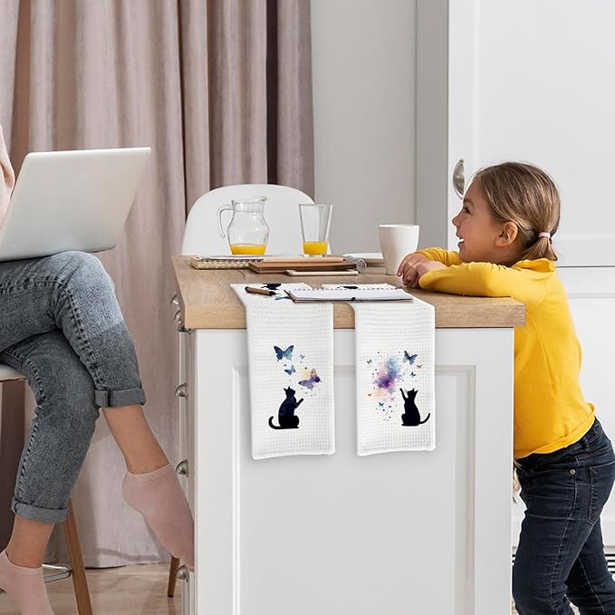 Black Cat Butterfly Kitchen Towels and Dishcloths Set of 2, Funny Cat Themed Dish Towels, Preppy Decorative Hand Tea Towels for Bathroom Kitchen, Gifts for Cat Lovers and Women, 16×24 Inches