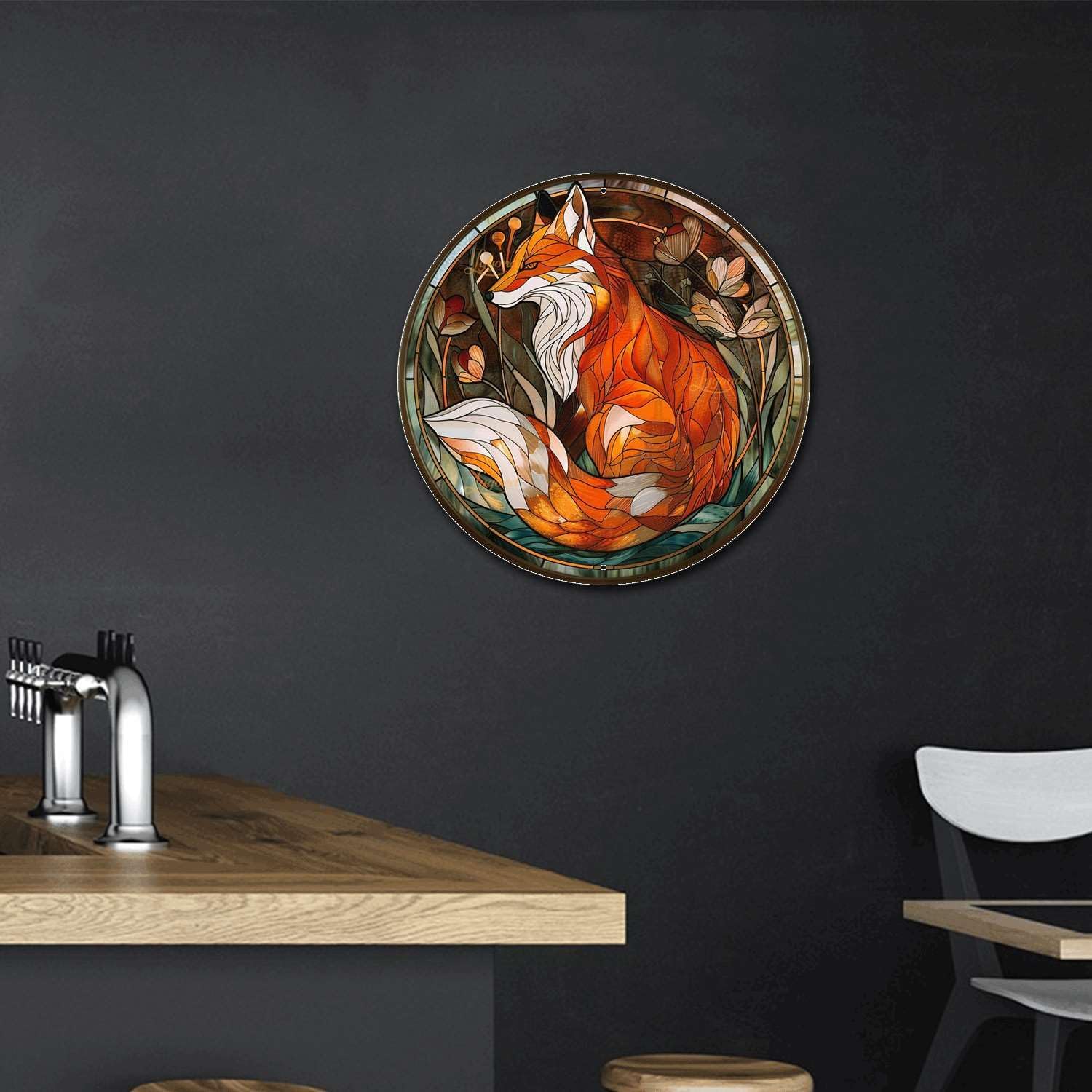 Lygond Metal Sign Tin Sign Circular Stained Glass Red Fox Funny Garden Signs for Garden 8×8 Inches
