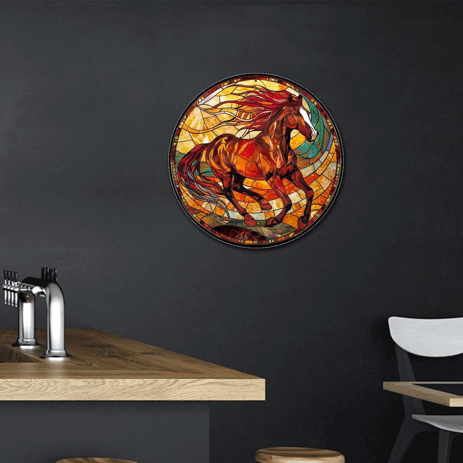 Lygond Metal Sign Tin Sign Circular Stained Glass American Mustang Garden Tin Sign for Gift 8×8 Inches