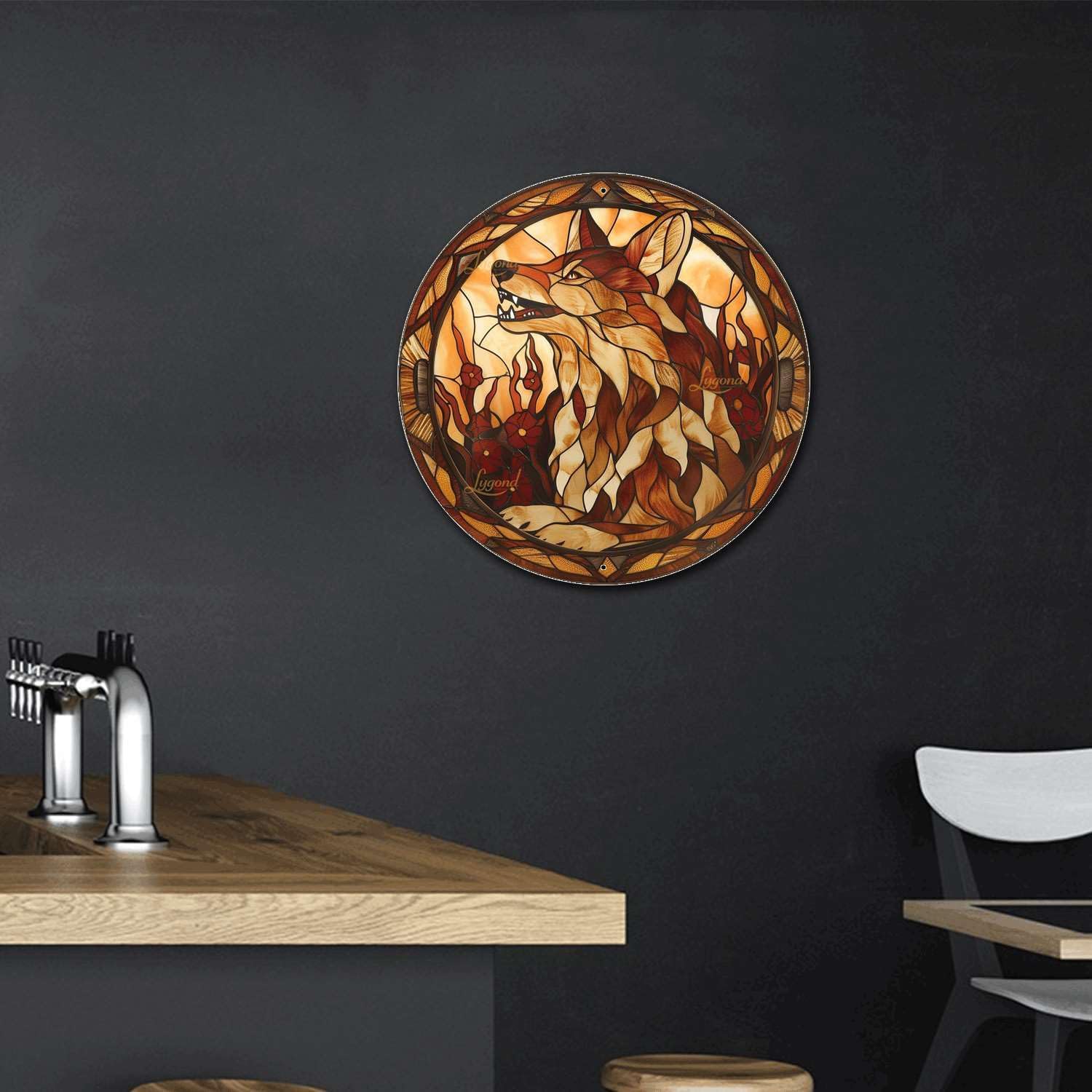 Lygond Metal Sign Tin Sign Circular Stained Glass Coyote Tin Signs Gardening for Bar 8×8 Inches