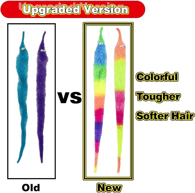 - 🔮【FUN FUZZY WORMS】 This rainbow magic fuzzy worms toy are made of soft polyester and transparent string, feels very comfortable.The worm on string bulk two realistic eyes design make it look vivider and cuter. This is a sweet monster suitable for children and adults, which can be used as toys for carnival kid party favors, birthday parties, holiday parties, Halloween, children's day, etc.