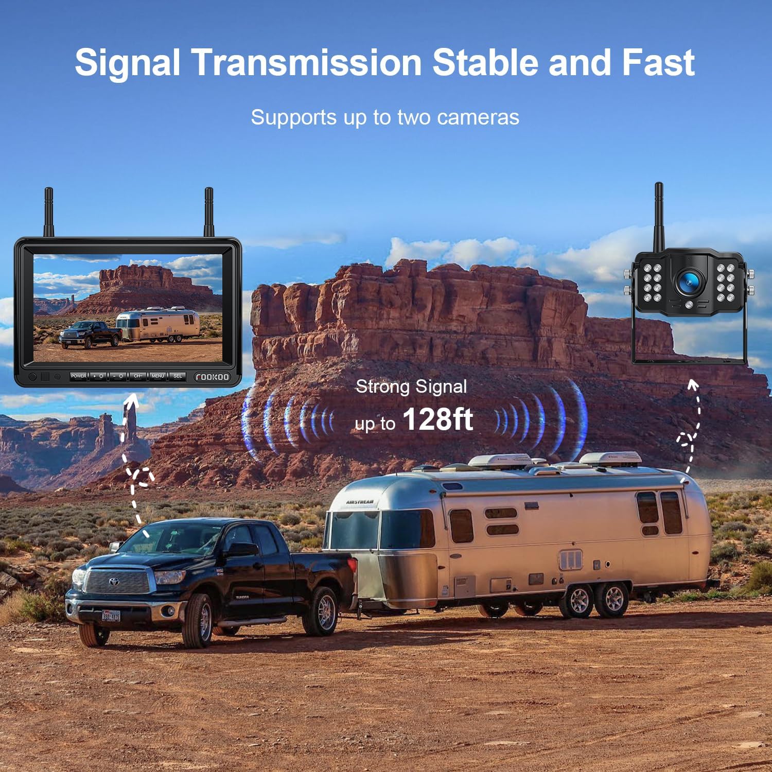 - Stable Signal & DIY Guide Lines: The camera uses 2.4G digital wireless point-to-point transmission technology, and in general, the camera and monitor can work normally within a range of 128ft.The parking line can be turned on/off directly by the button on the screen, and the width/height/position of the parking line can also be adjusted