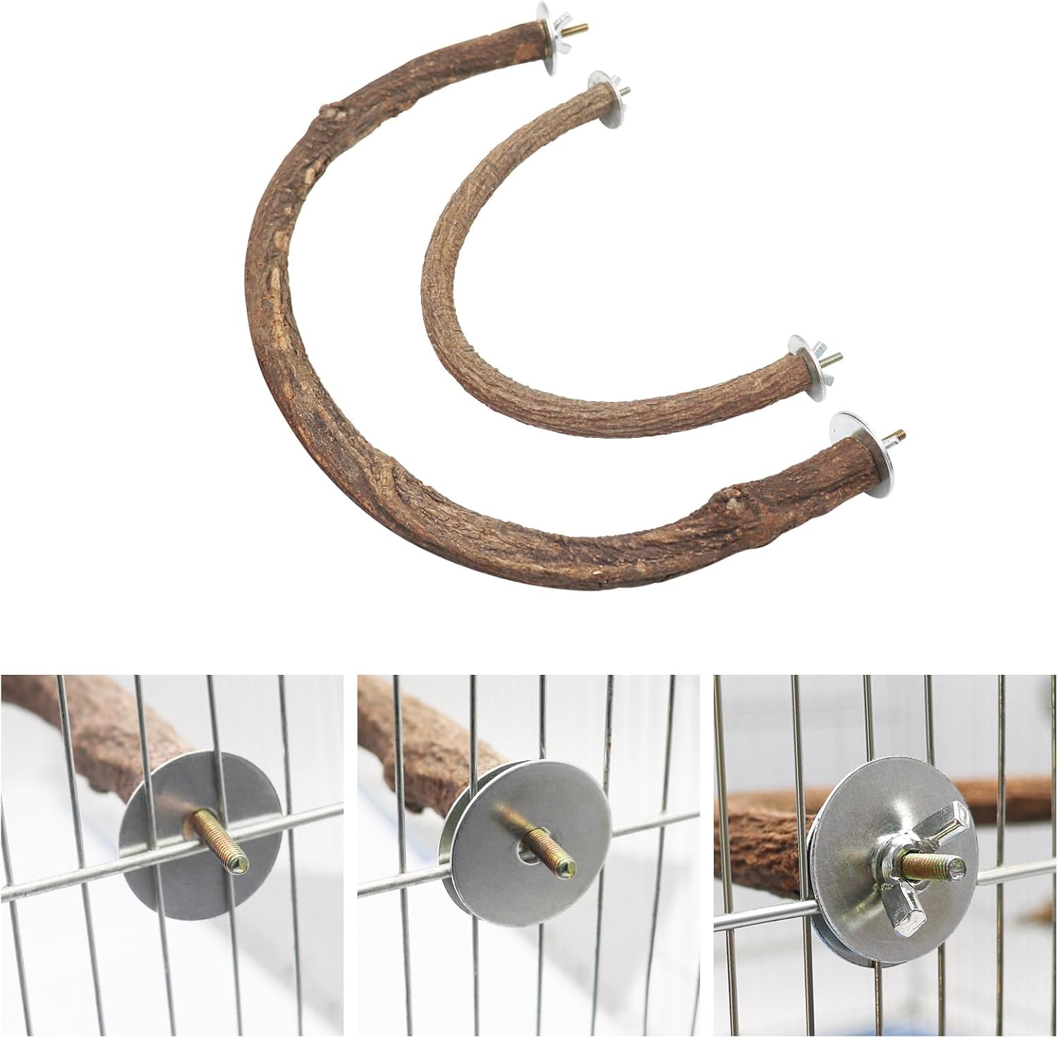 - Set of Two U-Shaped Bird Perches: This set includes two U-shaped natural wooden bird perches, with one large and one small size to accommodate different birdcage configurations. Each perch comes with screws and wing nuts on both ends, making them easy to install inside or outside bird cages of various sizes.