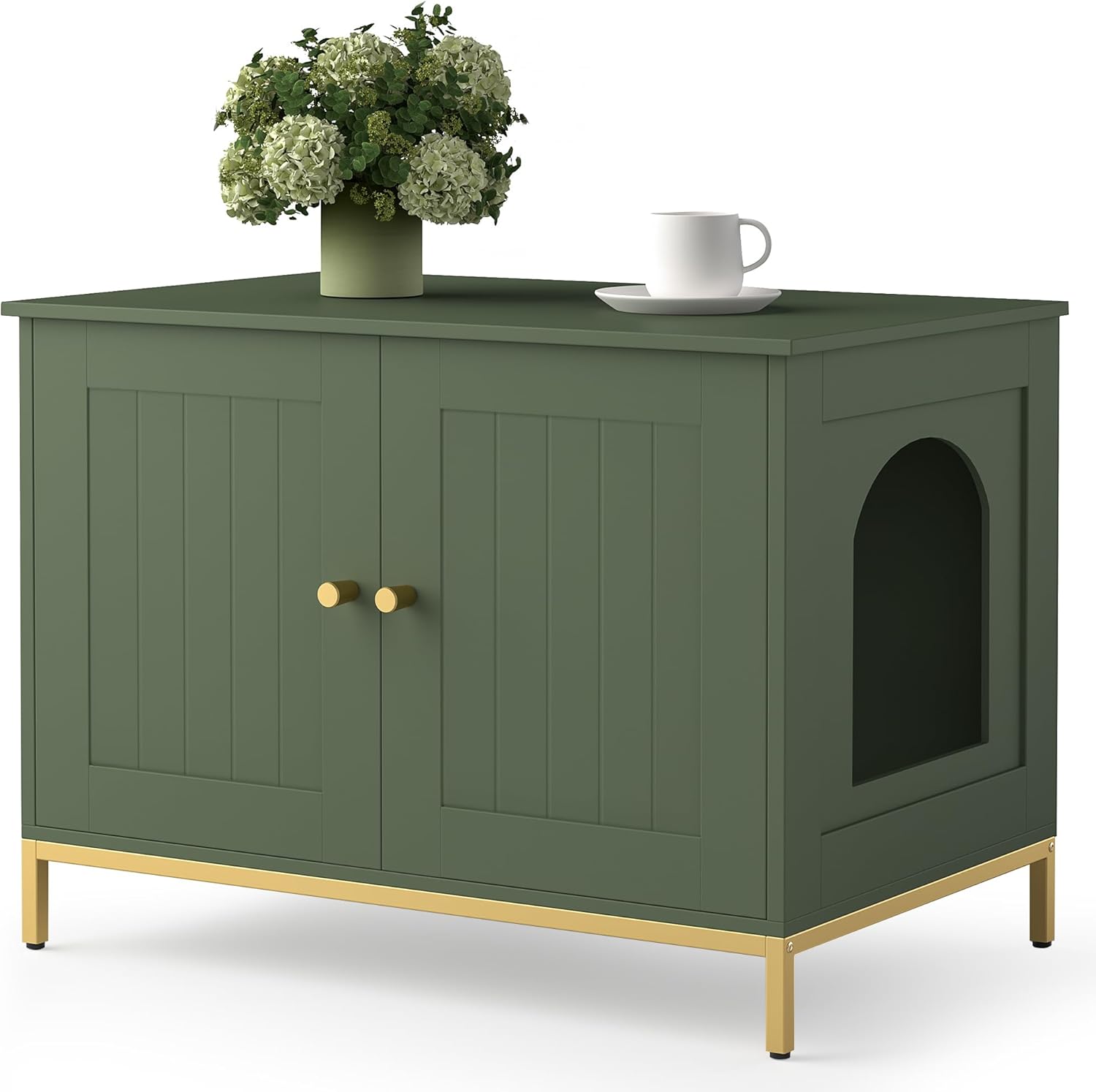 - Modern style: The cat litter box cabinet features white finish and metallic gold-colored metal frame, adding an elegant and stylish touch to your home decor. Its minimalist design and exquisite detailing inject a touch of luxury and sophistication into your living space.