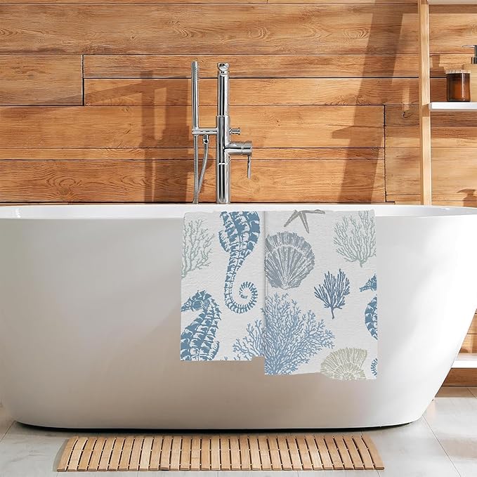Seahorse Seashells Starfish and Coral Hand Towel for Bathroom Set of 2,Blue Marine Lifes Bathroom Hand Towel,Soft Absorbent Decorative for Hotel Home Decor