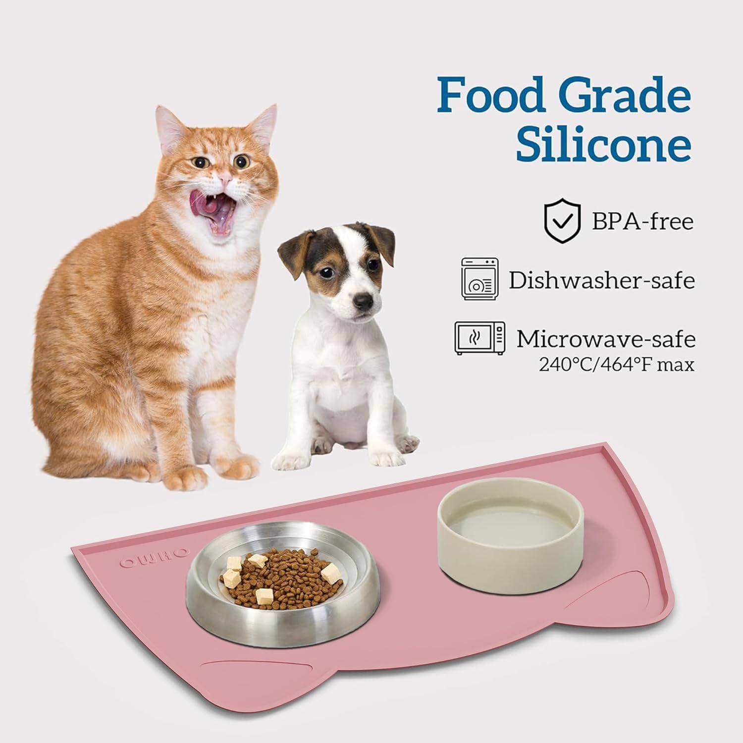 OHMO - Cat Food Mat, Silicone Pet Feeding Mat for Floor Non-Skid Waterproof Dog Water Bowl Tray, Easy to Clean Pet Placemat (Pink, 18 * 9.8'')