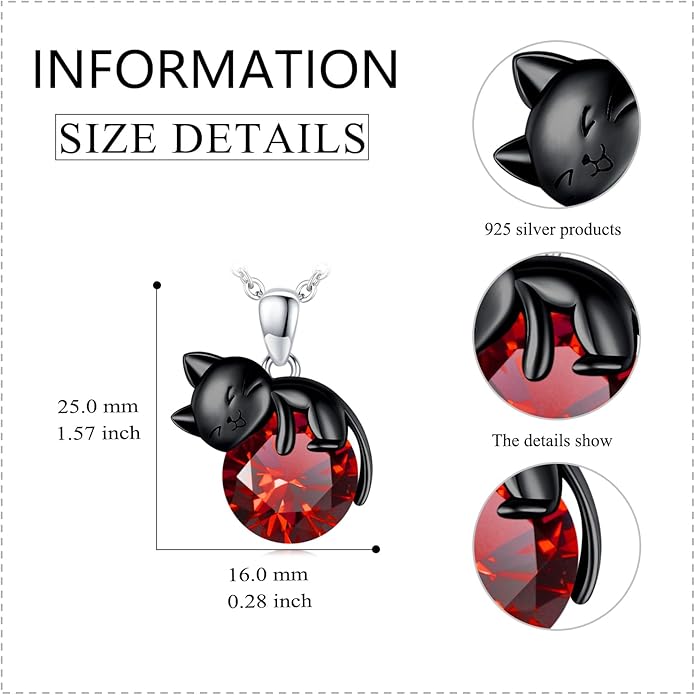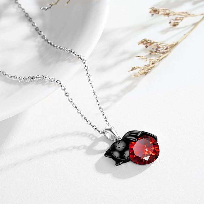 - πββ¬ Design: The necklace features a black cat charm dangling from a delicate chain, with a stunning January birthstone as the focal point. The combination of the sleek black cat and the deep red hue of the garnet birthstone creates a striking and unique piece of jewelry.