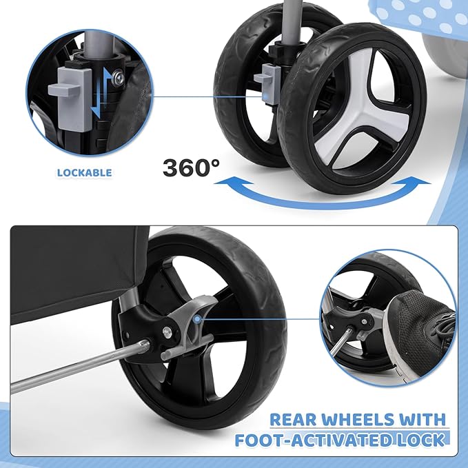- Advanced Wheel Suspension, Braking & Safety System: Designed for stability, maneuverability, and control, our pet stroller features 360° swivel front wheels for effortless navigation, while the shock-absorbing rear wheels ensure a smooth, stable ride on various terrains. For added safety, the dual rear-wheel braking system provides a secure stop on slopes and uneven surfaces, giving pet owners peace of mind during strolls