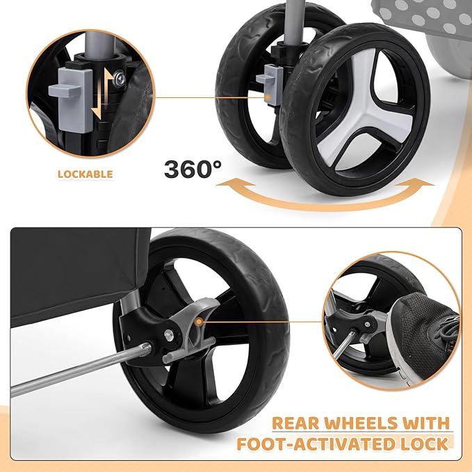 - Advanced Wheel Suspension, Braking & Safety System: Designed for stability, maneuverability, and control, our pet stroller features 360° swivel front wheels for effortless navigation, while the shock-absorbing rear wheels ensure a smooth, stable ride on various terrains. For added safety, the dual rear-wheel braking system provides a secure stop on slopes and uneven surfaces, giving pet owners peace of mind during strolls