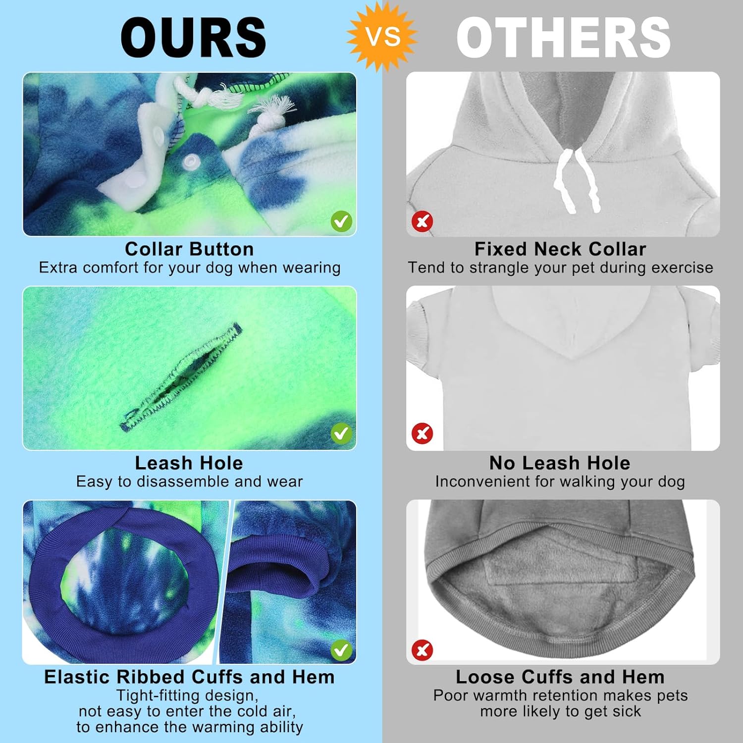 - Easy On Dog Clothes: Pull-on design with stretchy neck and leg openings makes dressing effortless. Soft V-neck buttons prevent fur snags, while the lightweight construction won't overwhelm sensitive dogs. Each dog hoodie features vibrant, fade-resistant tie-dye patterns for standout style. Perfect for holiday photos or daily walks, these dog clothes maintain color through repeated washing and wear