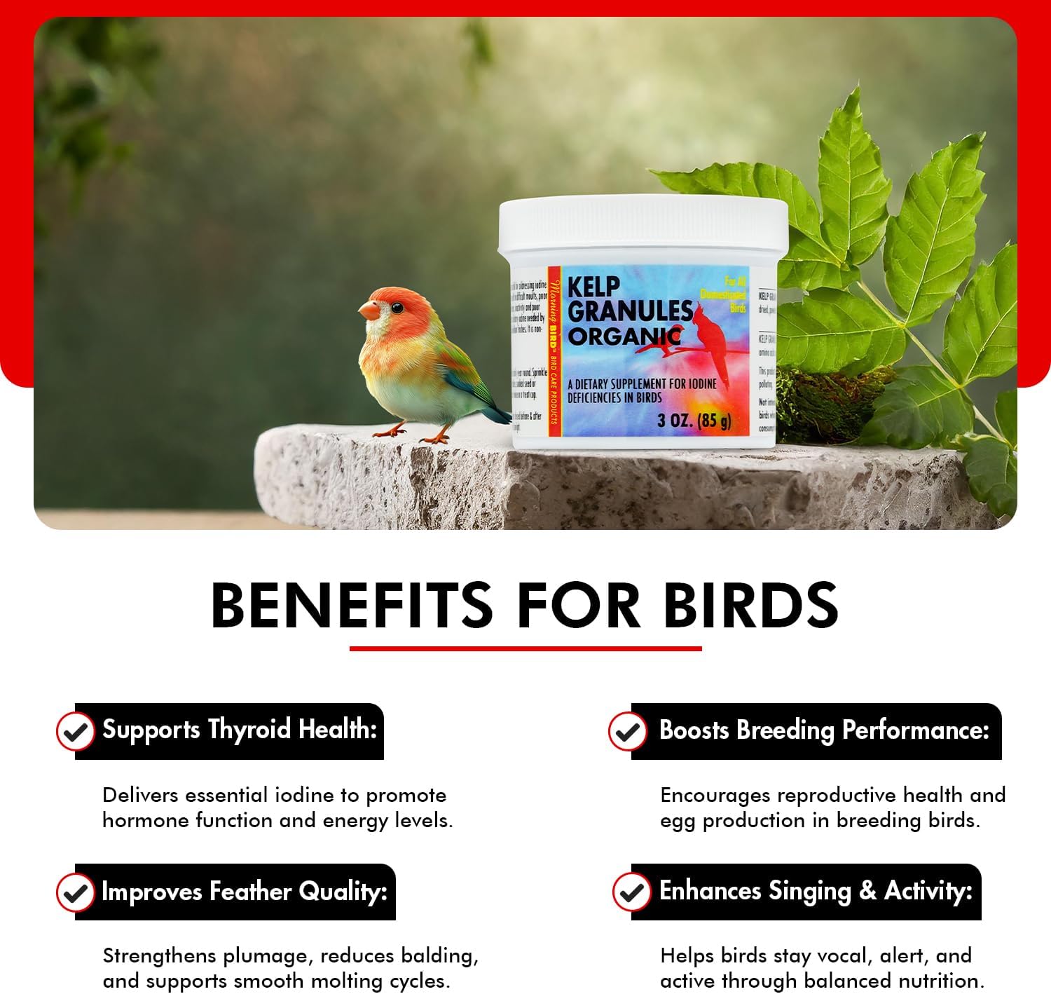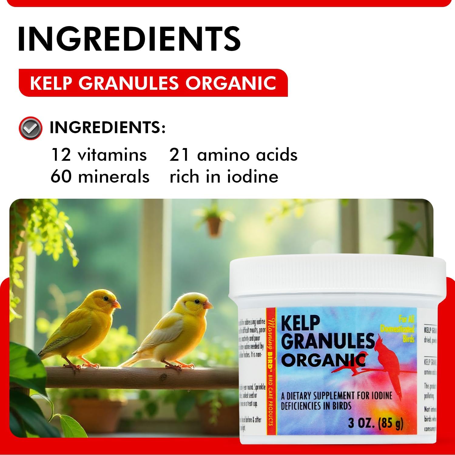 Morning Bird Kelp Granules 3 Oz – Iodine Supplement for Birds – Supports Feather Growth, Molting & Metabolism – Rich in Amino Acids, Trace Minerals & Natural Vitamins – Clean Nutrition for All Birds