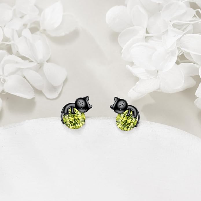 Sterling Silver Birthstone Black Cat Stud Earrings - Cat Birthstone Earrings for Women's Birthday Gift