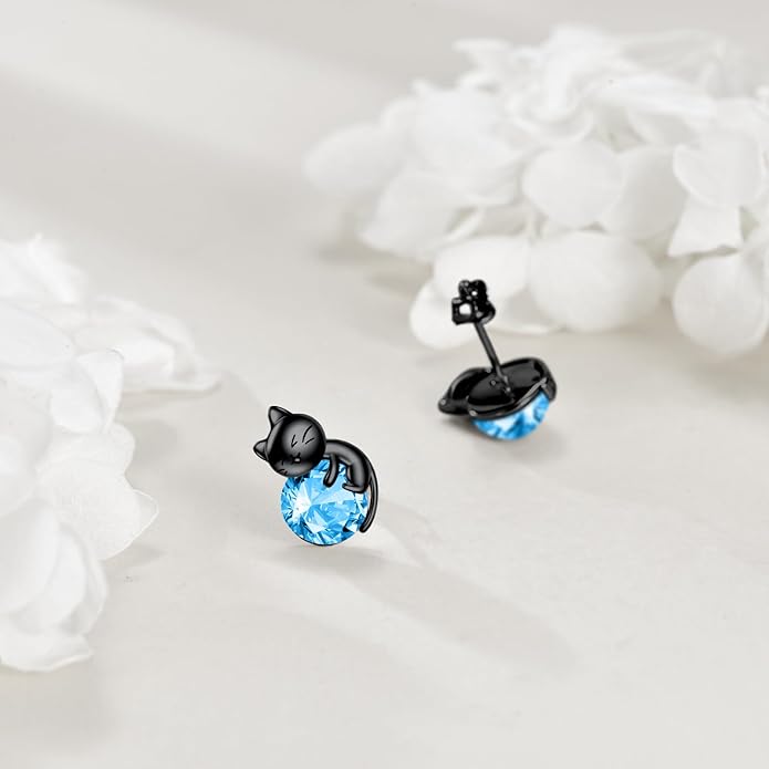 Sterling Silver Birthstone Black Cat Stud Earrings - Cat Birthstone Earrings for Women's Birthday Gift