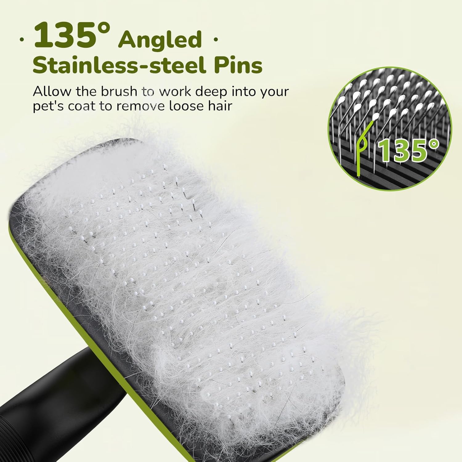 - EFFICIENT FUR REMOVAL, GENTLE ON YOUR PET'S SKIN : The pet hair brush is designed with fine 135° stainless steel bristles and gentle massage particles that effectively remove loose hair, dander, & dirt trapped beneath the fur without causing any discomfort or irritation to the pet's skin. Leave the pet's fur soft and shiny!