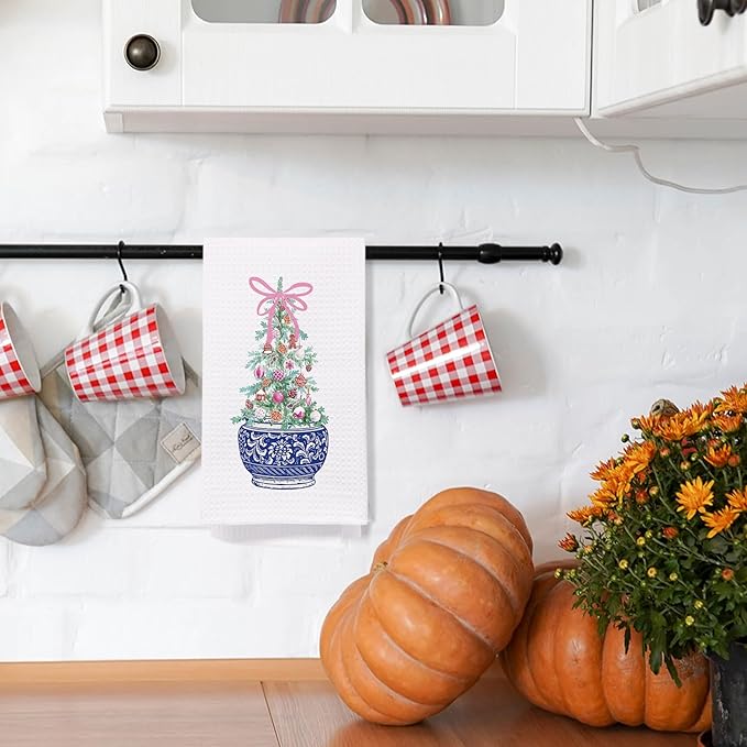 SPBL&L Chinoiserie Christmas Kitchen Towels, Pink Bow Christmas Tree Hand Towels for Bathroom, Blue and White Porcelain Chinoiserie Christmas Dish Towels, Christmas Kitchen Bathroom Decor, 16x24 Inch