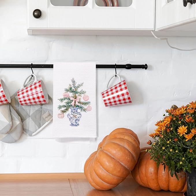 Chinoiserie Christmas Kitchen & Bath Towels, Pink Bow & Blue/White Dish Towels, 16x24 Inch