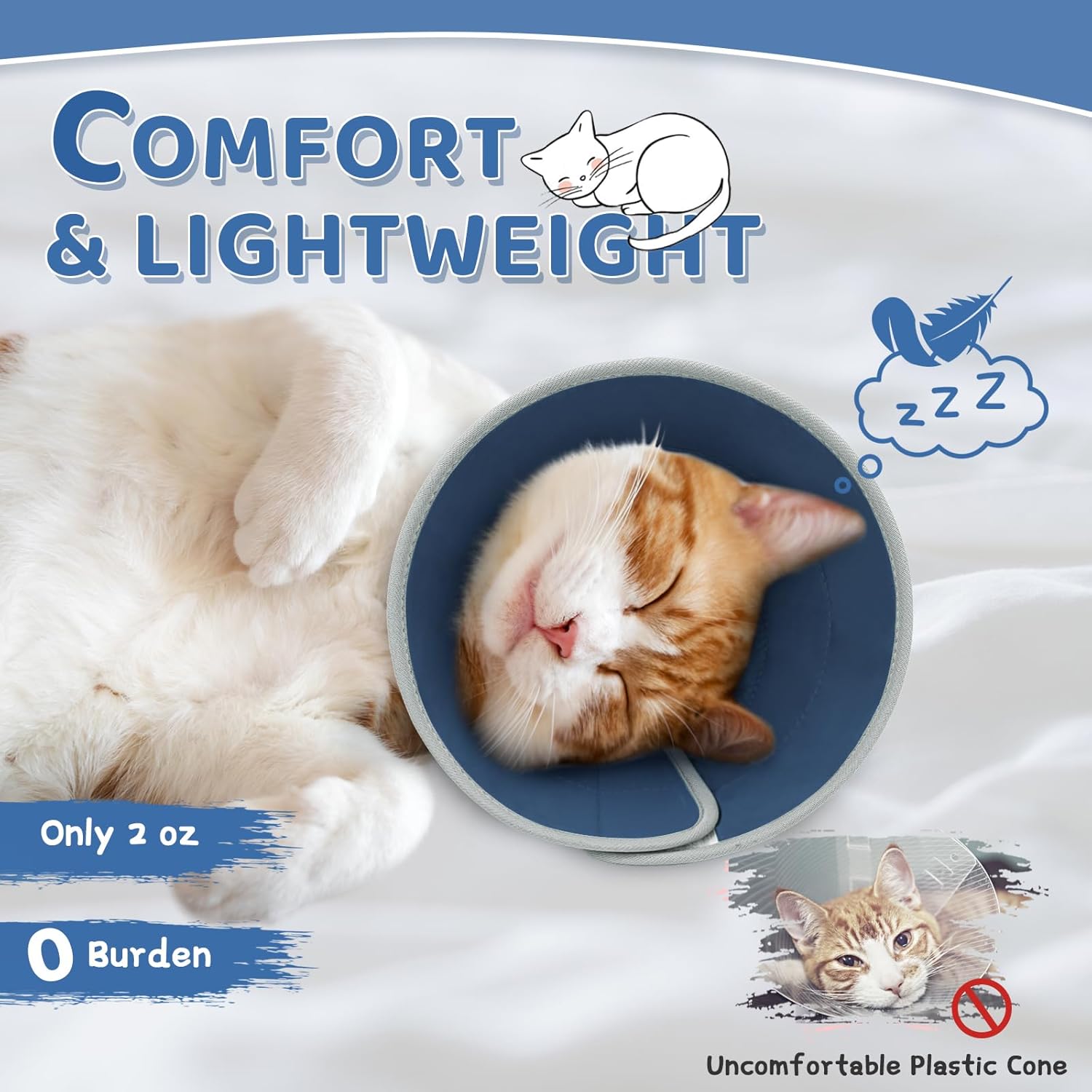 - 【Comfortable Kitten Cone】: This soft cone for cats is made of high-quality EVA material and PU fabric, comfortable and durable, lightweight and soft. It has improved the heavy, stuffy, and uncomfortable problems of the hard plastic Elizabethan collar. Your lovely cat will feel extra comfortable wearing it. And the foldable design allows your cute pet to eat normally, sleep relaxed, and enjoy playing as if it's not wearing anything