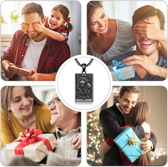 - ★ SKULL NECKLACE FOR WOMEN ★ The Lovers, the seventh tarot card, represents love, passion, deep connections, and attraction. It signifies a strong bond and harmony between two individuals. This The Lovers tarot card necklace can bring encouragement and support to make brave, heartfelt choices. Surprise your loved one with this lover necklace!