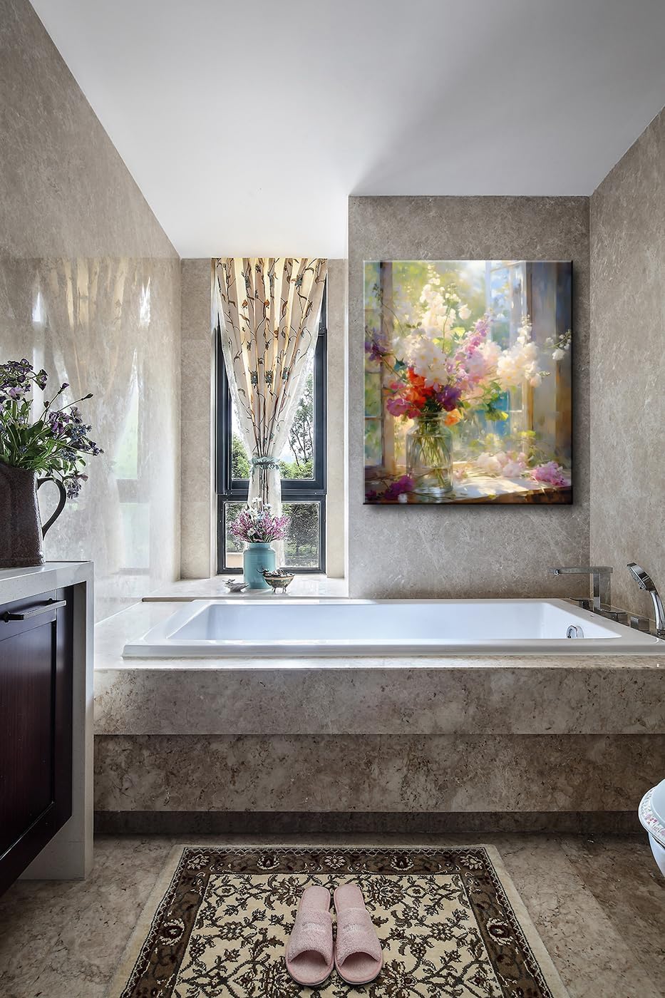Colorful Flower Framed Canvas Wall Art, Watercolor Floral Bathroom Wall Decor, Spring Nature Wall Painting, Multicolor Botanical Art Print for Living Room, Bedroom, Office - 12X15