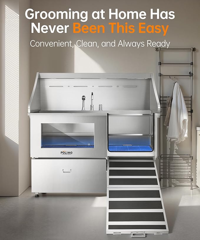 - Innovative and Practical Design: The POLIMO dog grooming station features multiple outstanding design elements: ① IP65 Waterproof high-brightness LED spotlight. ② Grade A tempered glass observation window. ③ The bathtub’s side panels feature a curved slide design, making it easier to operate④ Two-piece floor grid, adjustable to three different heights. ⑤ Sliding storage drawer for organized storage. ⑥ Multi-function faucet and showerhead, adjustable to left, center, or right positions.⑦ Two drainage options are available: one with a pet hair catcher and another stainless steel drain pipe featuring an odor-blocking S-trap design
