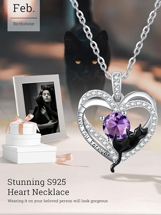 - 【I Love You Forever】 Companionship is the longest confession of love. The frame of the birthstone necklace consists of two hearts, representing love and romance; The Amethyst birthstone is embedded inside, and the black cat embraces the jewelry, representing love and companionship; The edge is also engraved with 'Love You Forever', symbolizing love and commitment. A romantic necklace gift perfect for wives, girlfriends, mothers, grandmothers, daughters, and more.