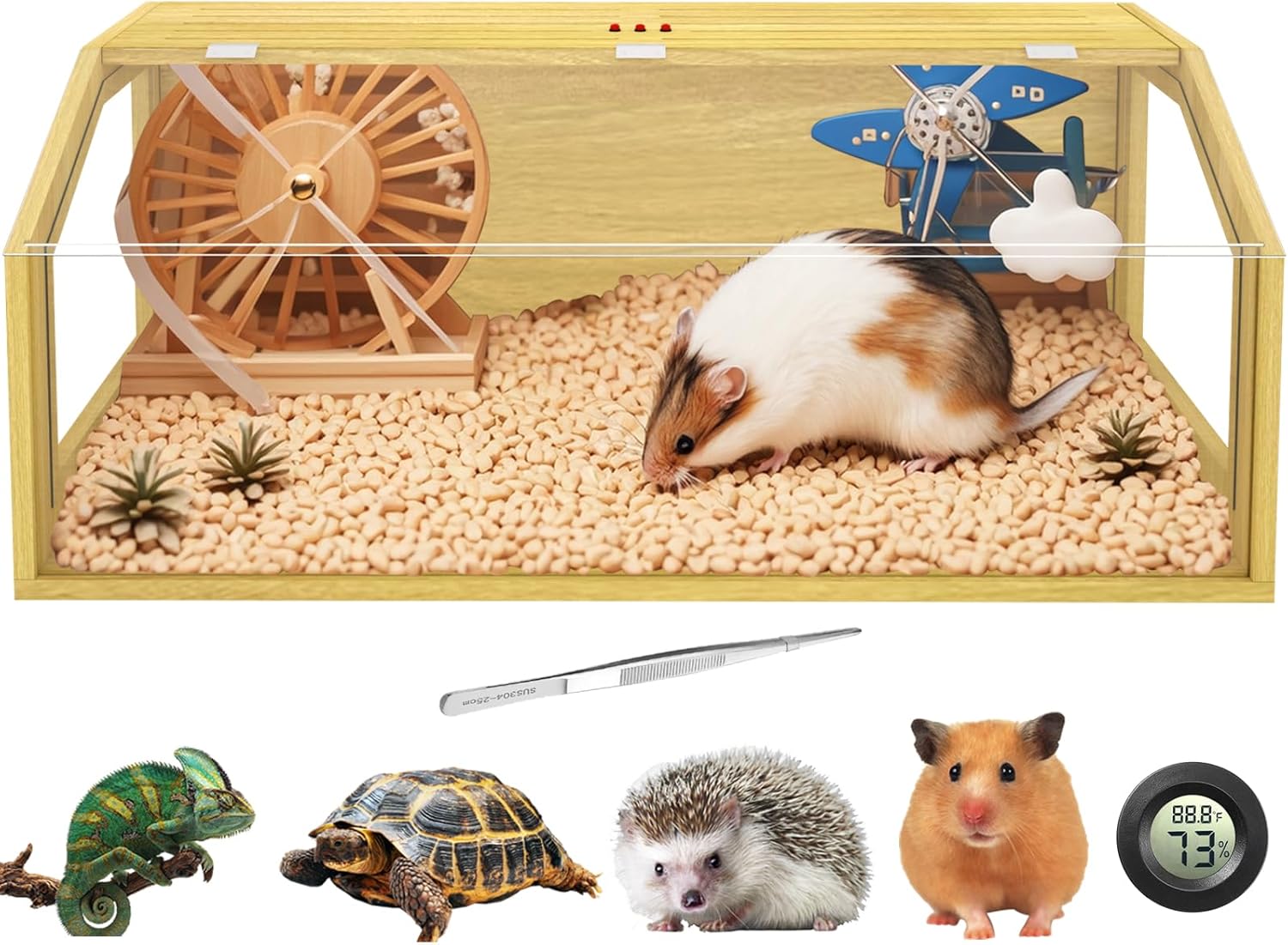 - Cozy Hamster Habitat: FHNI hamster cage is crafted from thick natural wood and thick clear acrylic materials, featuring eccentric bolt assembly for enhanced stability and durability
