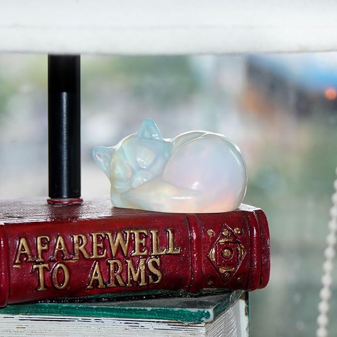 OwMell Tiny Sleeping Cat Statue Hand-Carved Healing Stone Gemstone Little Kitten Statue Figurine 2" - Opal Small