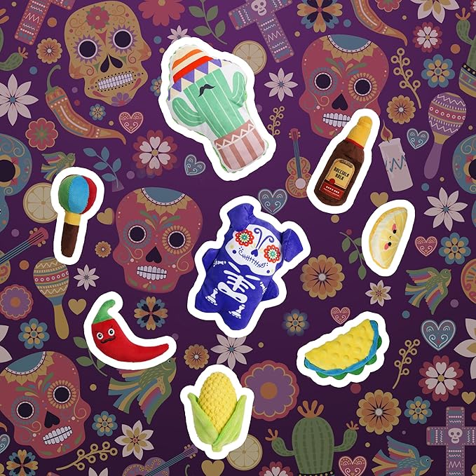 - Unique Mexican-Themed Toy Set – This dog toy bundle includes 8 adorable plush toys inspired by Mexican culture: a cute dog, cactus, taco, corn, orange slice, tequila, chili pepper, and maracas. Each piece celebrates the vibrant Mexican lifestyle
