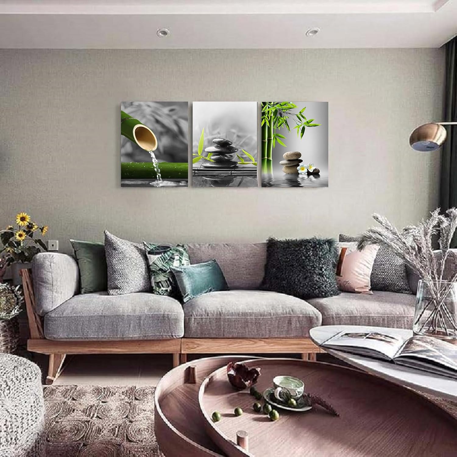 - Zen bathroom decor HD canvas zen stone wall art green plant pictures printing artwork by using a high quality mirrored gallery wrapping technique which extends the picture all the way around the wooden frame. This creates an immersive 3D effect and makes the printed artwork look great without adding an expensive additional frame. And metal hanging hook(s) already nailed on frame the canvas art is ready to hang out of the box.