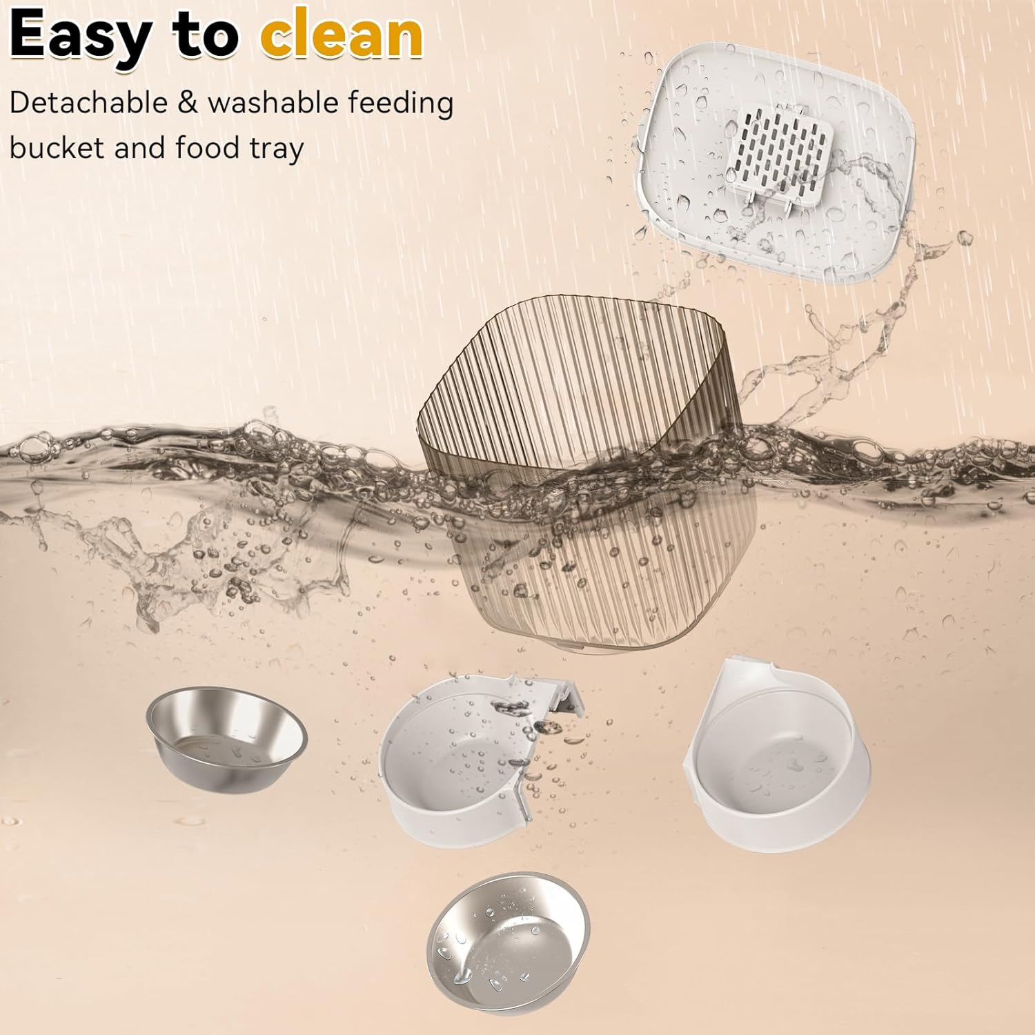 - EASY TO CLEAN: This automatic cat food dispenser (BPA free) comes with a removable trough and stainless steel food bowl, which can be cleaned more thoroughly, giving your beloved pets the most intimate and hygienic dining experience, and say goodbye to dirty bowl troubles from now on!