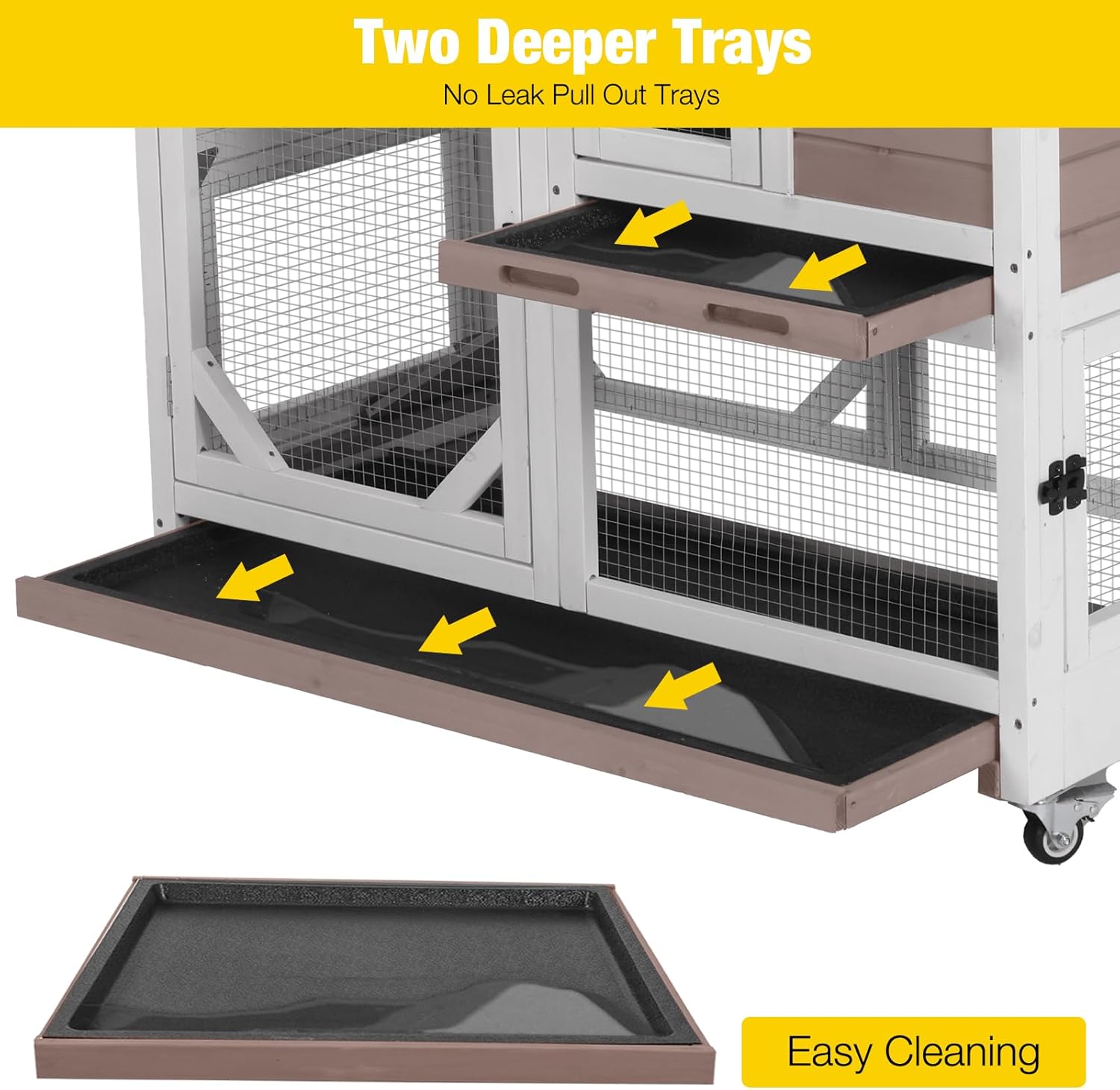 - 2 No Leak Trays: Keeping your pet's living space clean and dry with our two deeper pull-out trays. These trays are designed to prevent leaks, making cleanup a hassle-free task for you and a healthier living condition for your bunny