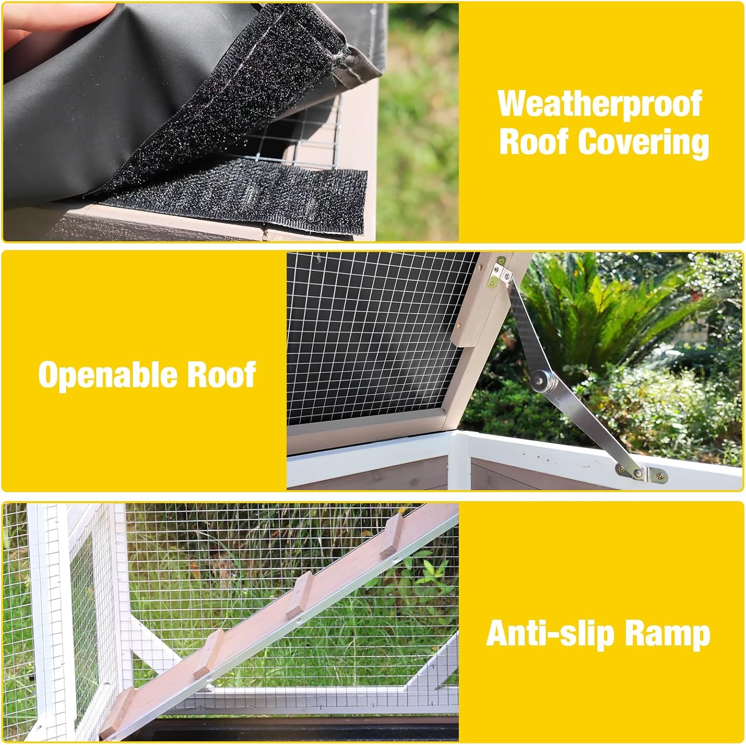 - Openable Roof: The openable roof provides convenient access for feeding and interaction. Additionally, the waterproof roof covering protects your pet from the elements and also provides shade on summer days making rabbit hut suitable for both indoor and outdoor use