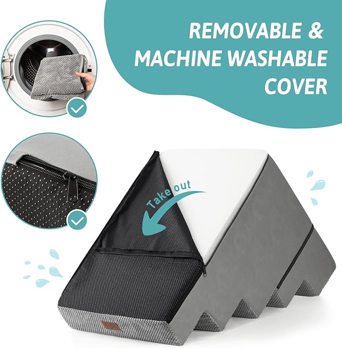 - Non-Slip Base and Removable Cover: Our dog steps for beds are equipped with a non-slip base featuring rubber dots for extra grip, minimizing movement during use. The pet steps cover is waterproof on the inner side, so you don’t have to worry about stains seeping into the foam. The outer cover is removable and machine washable for easy cleaning