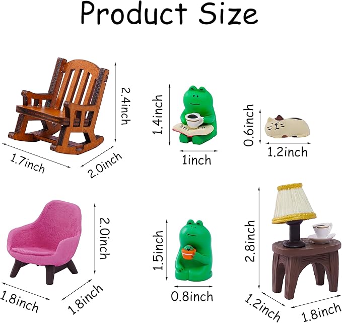 - Cute Desktop Figurines: This set of mini figurines includes a frog reading and drinking coffee, a frog tasting wine, a kitten, a wooden rocking chair, a pink sofa stool and a table lamp, a total of 6 pieces.
