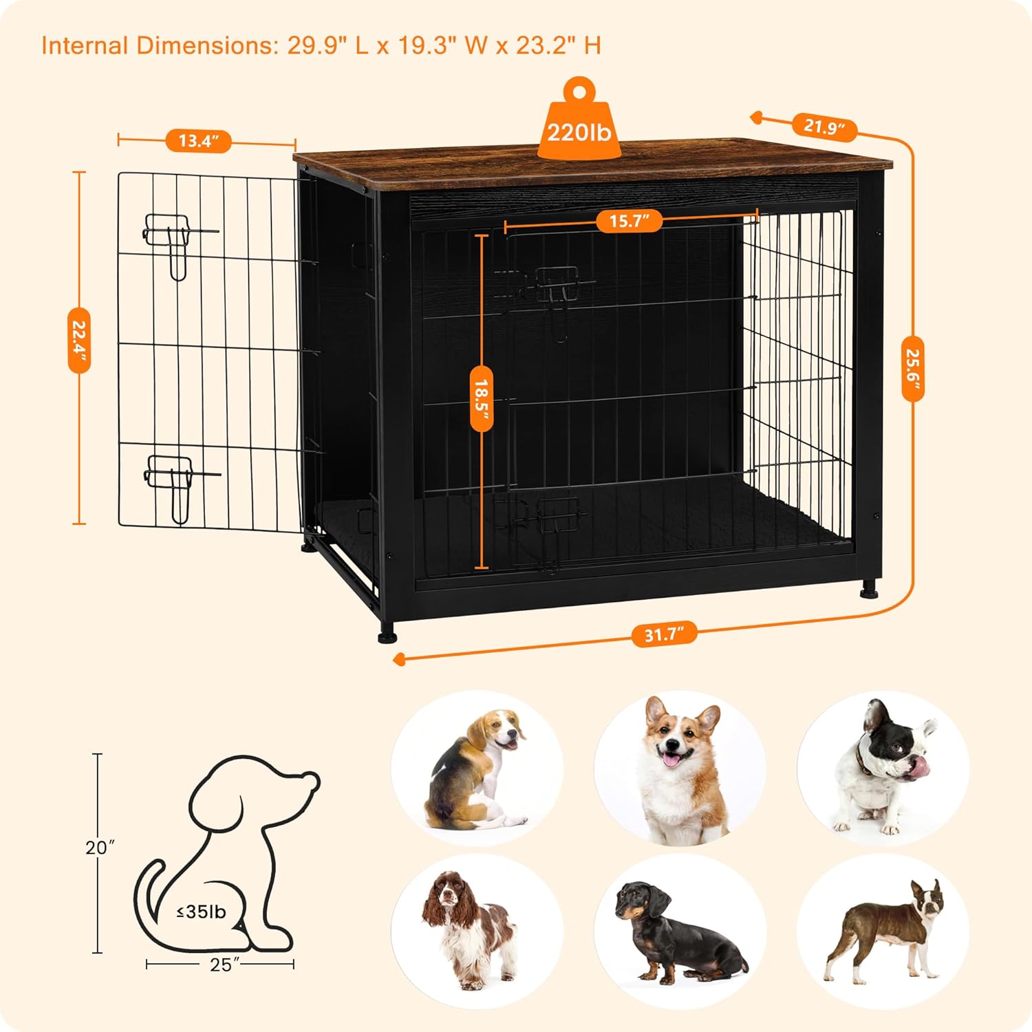 DWANTON Dog Crate Furniture with Cushion, Wooden Kennel Table with Double Doors, Indoor Dog House, Medium Size, 32.5" L, Black+Rustic Brown