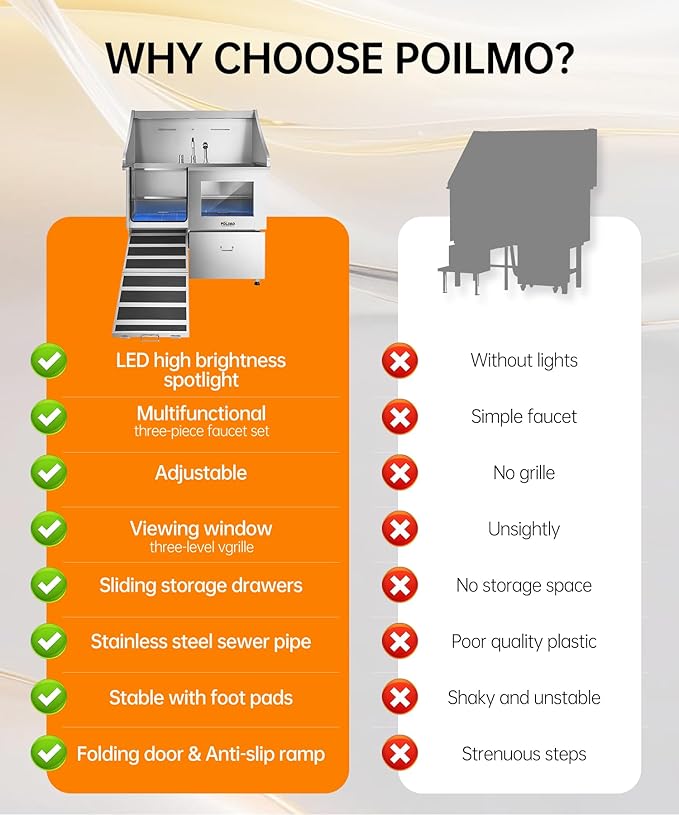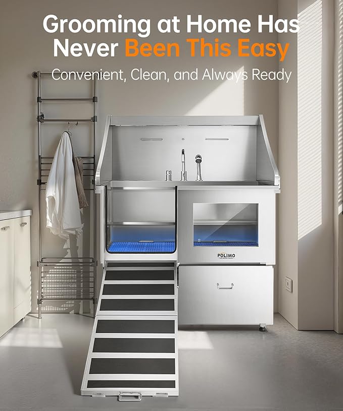 - Innovative and Practical Design: The POLIMO dog grooming station features multiple outstanding design elements: ① IP65 Waterproof high-brightness LED spotlight. ② Grade A tempered glass observation window. ③ The bathtub’s side panels feature a curved slide design, making it easier to operate④ Two-piece floor grid, adjustable to three different heights. ⑤ Sliding storage drawer for organized storage. ⑥ Multi-function faucet and showerhead, adjustable to left, center, or right positions.⑦ Two drainage options are available: one with a pet hair catcher and another stainless steel drain pipe featuring an odor-blocking S-trap design