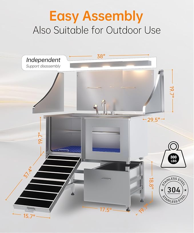 - Superb Quality and After-Sales Service: Our dog bathing station is crafted from Japanese military-grade 304 stainless steel, molded in one piece for strength and durability, resistant to deformation and rust. The three-piece faucet set is made of pure copper and stainless steel. Backed by multiple patents, this dog shower tub can be used indoors or outdoors. We offer a 2-year after-sales guarantee and 24/7 customer support, ensuring a pleasant bathing experience for your pet