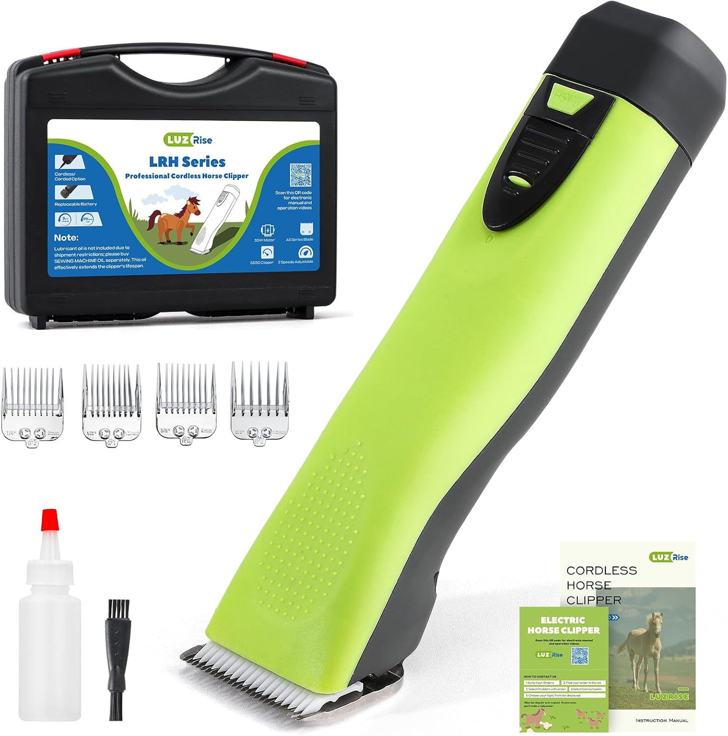 - [PACKING LIST]: 1 x Electric horse clipper; 4 x Magnetic guide combs; 1 x Charger; 1 x Cleaning brush; 1 x Oil bottle (WITHOUT oil); 1 x Replacement blade drive part; 1 x Durable carriage case; 1 x Operating manual. PLEASE NOTE: Lubricant oil is not included due to shipment restrictions; please buy SEWING MACHINE OIL separately. This oil effectively extends the clipper’s lifespan.