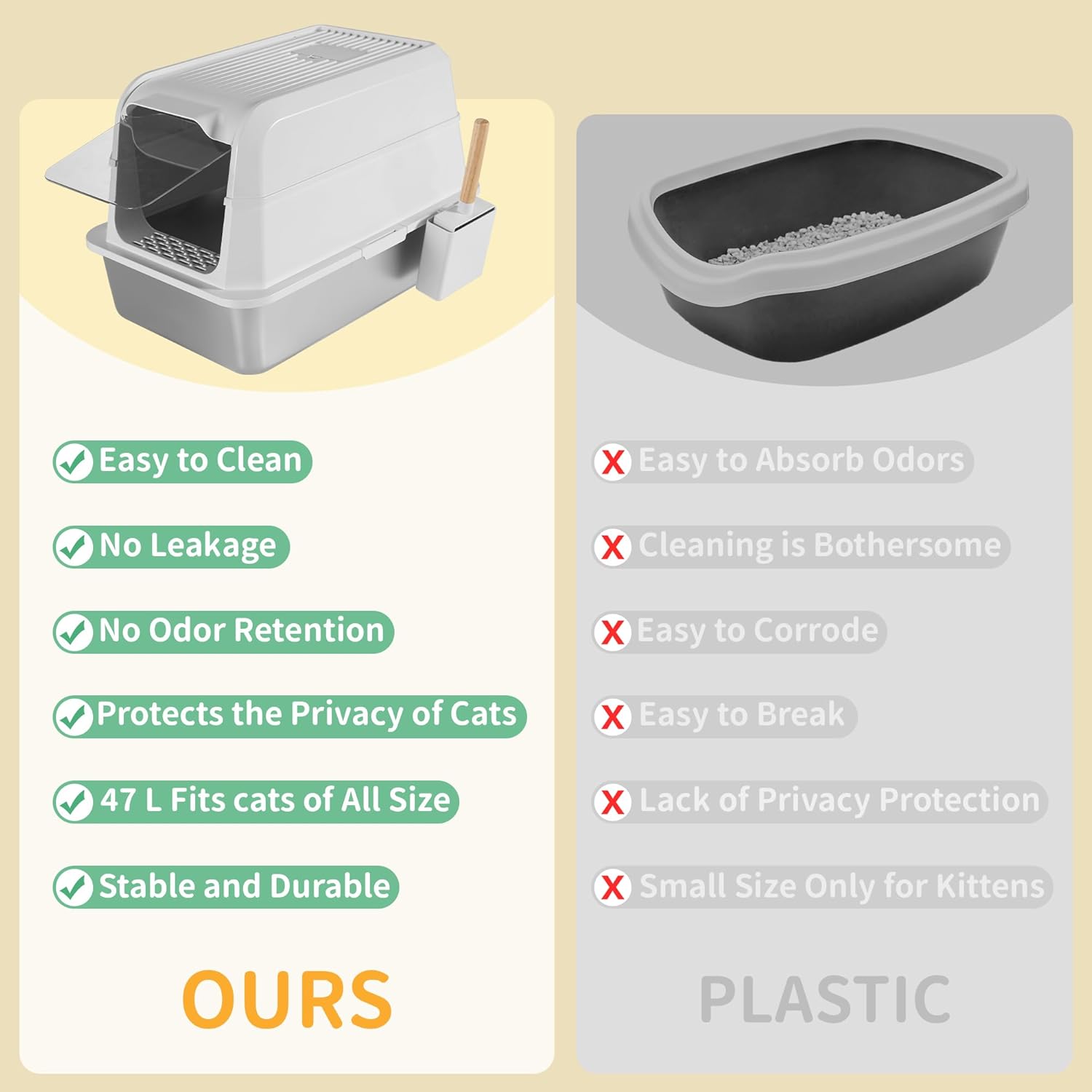 - 【Leak-Proof Stainless Steel Cat Litter Box】Our enclosed cat litter boxes is interior is equipped with a sloped anti - leak plate and a seamless connection design. This not only ensures that urine is completely contained within the box, preventing any leakage through gaps, but also stops litter from scattering. Whether your cat has a large urine volume or is an active digger, our litter box provides a mess - free solution.