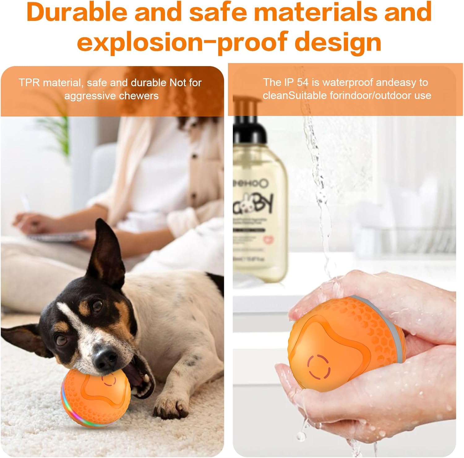 - THICK WASHABLE CASE: This pet toy ball is made of safe, bite-resistant material that stands up to your dog's enthusiastic play. The sturdy upgraded shell ensures durability and you can use it with confidence.IP54 waterproof rating, easy to clean, can be washed directly with water (insert must be removed). [The ball is not suitable for heavy chewers].