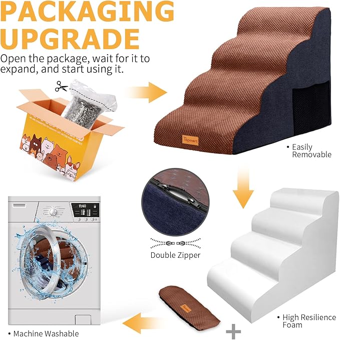 - Waterproof, Washable Cover: The surface of the cover is made of corduroy, the bottom of the dog paw pattern made of silicone, the sides and back are made of suede, all-round to achieve the effect of non-slip. Cover added waterproof layer to protect the sponge from getting dirty. Even if the pet accidentally pee on the dog ladder, will not leave a mark on the sponge. Only need to clean the cover can be. Cover can be machine washed.
