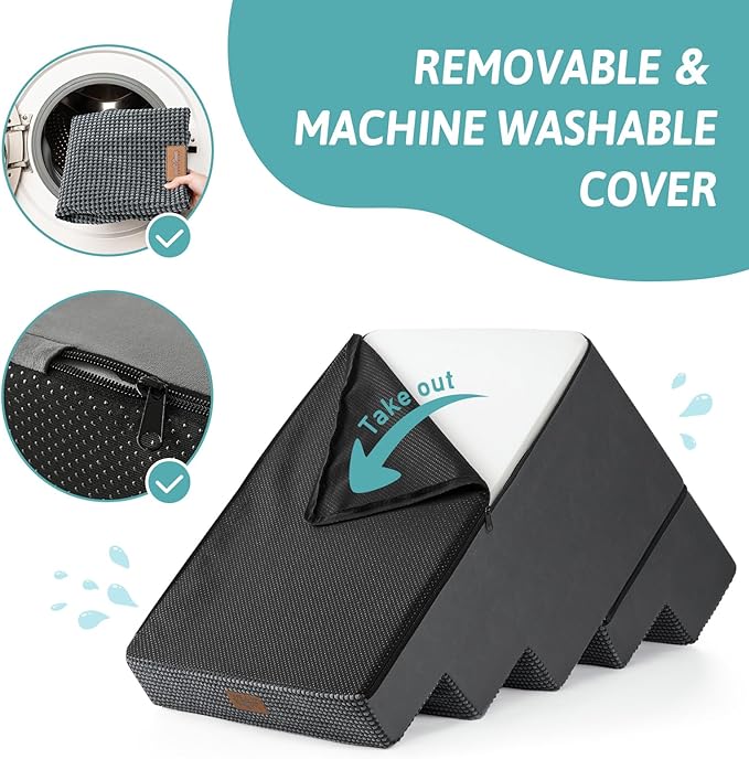 - Non-Slip Base and Removable Cover: Our dog steps for beds are equipped with a non-slip base featuring rubber dots for extra grip, minimizing movement during use. The pet steps cover is waterproof on the inner side, so you don’t have to worry about stains seeping into the foam. The outer cover is removable and machine washable for easy cleaning