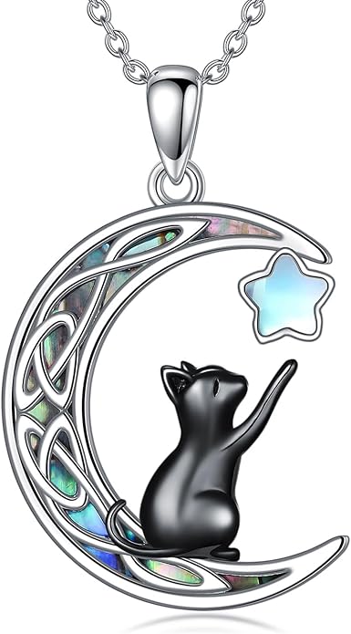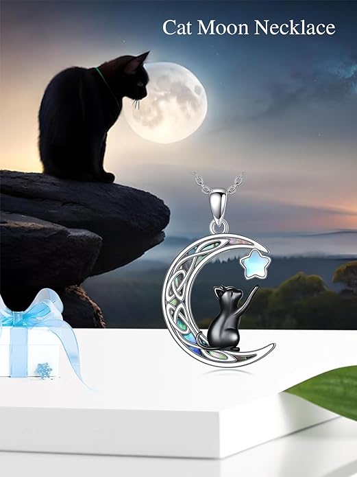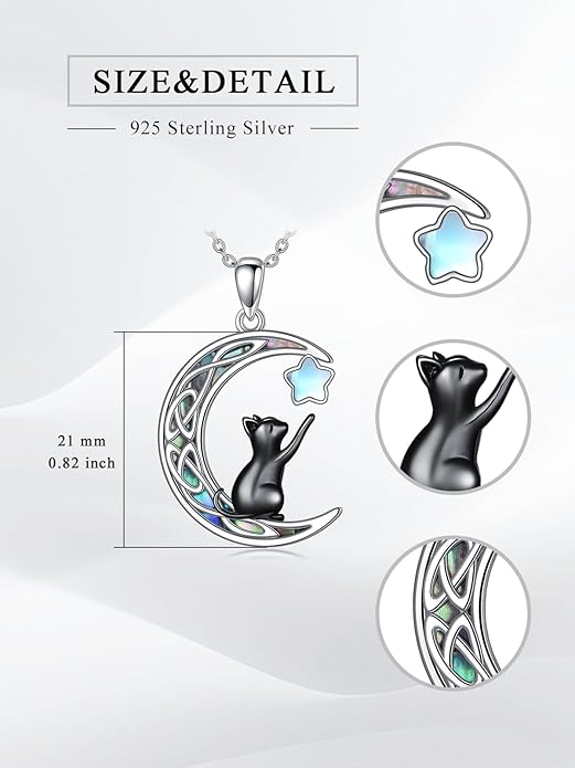 - Sterling Silver Black Cat Necklace: Cat pendant made of 925 sterling silver and celtic moon made of abalone shell