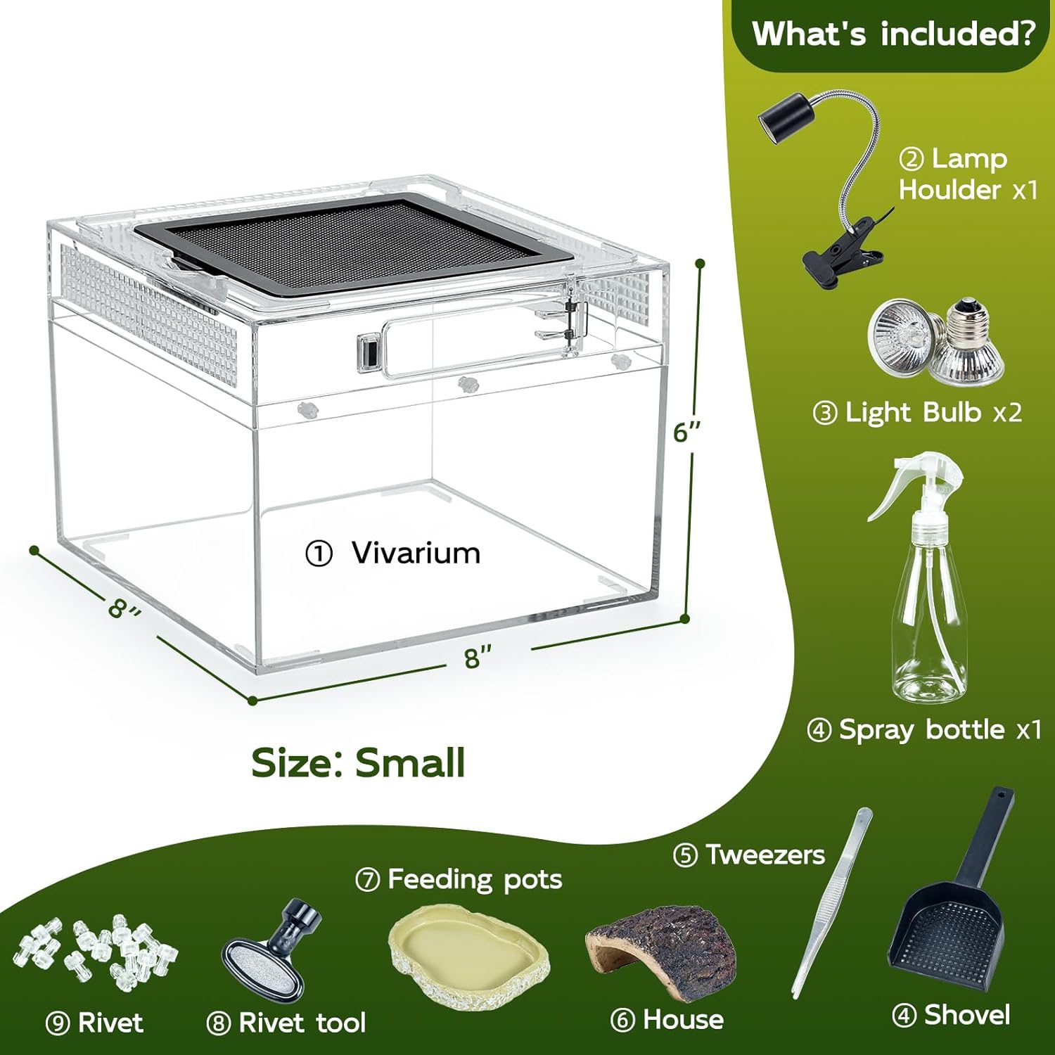 - Included Components : Heat Lamp, Hideout, Shovel, Spray Bottle, Tweezers