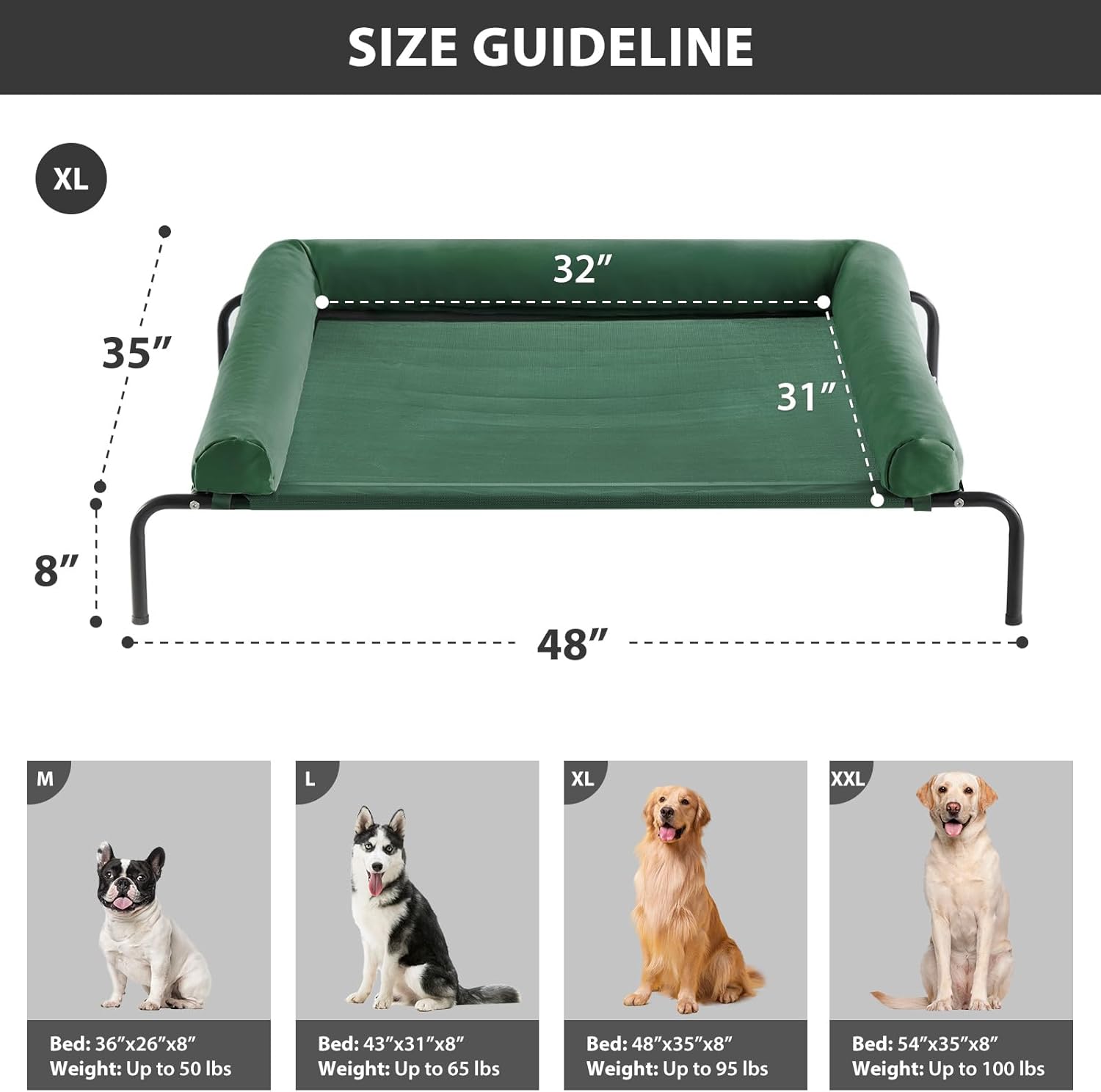 • 【EASY ASSEMBLE COOLING ELEVATED DOG BED SIZE】: Outdoor elevated dog bed for medium and large dogs up to 95 lbs. Very easy to assemble — setup takes just minutes, and even seniors or children can do it. The lightweight design adds portability, making it perfect for travel.