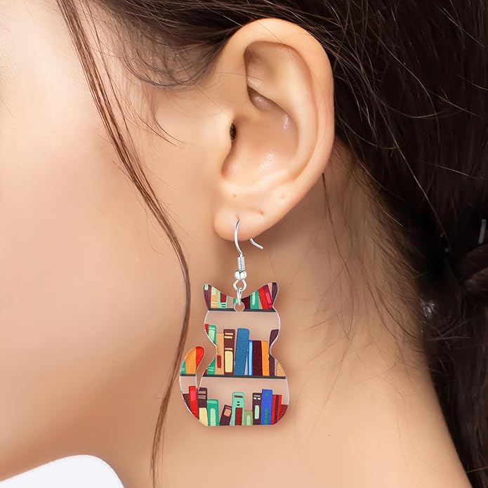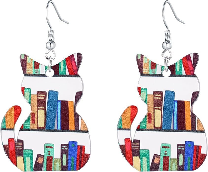 - ❤❤MATERIAL❤❤ Bookcase cat dangle earrings adopt a geometric resin acrylic printed book frame pattern,a smooth,matte texture,personalized animal style, ❤❤PLEASE remove the protective film on the surface of the earrings before wearing them !!❤❤