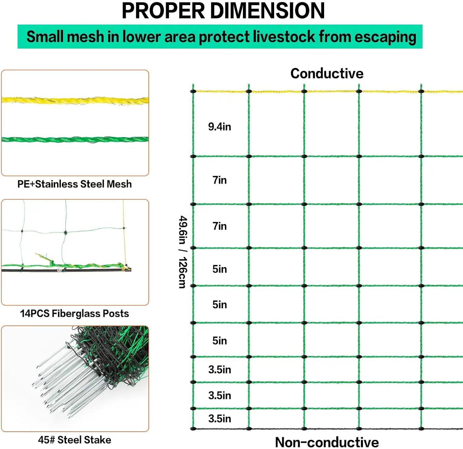 Electric Fence Netting, 49.6" H x 164' L, PE Net Fencing Kit with 14 Posts Double Spiked, Utility Portable Mesh for Sheep Hogs Goats Deer Dogs Lambs Used in Backyards Farms Ranches Patio, Green